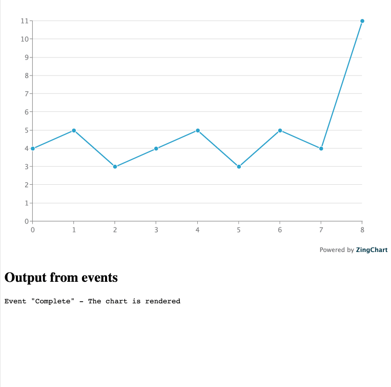 By binding a function to a known ZingChart event prop, we can perform custom actions when a chart emits an event. In the example below, the event node_mouseover is emitted and its contents are displayed.